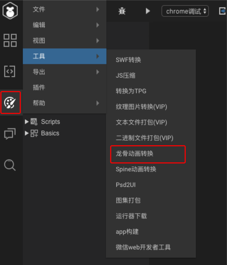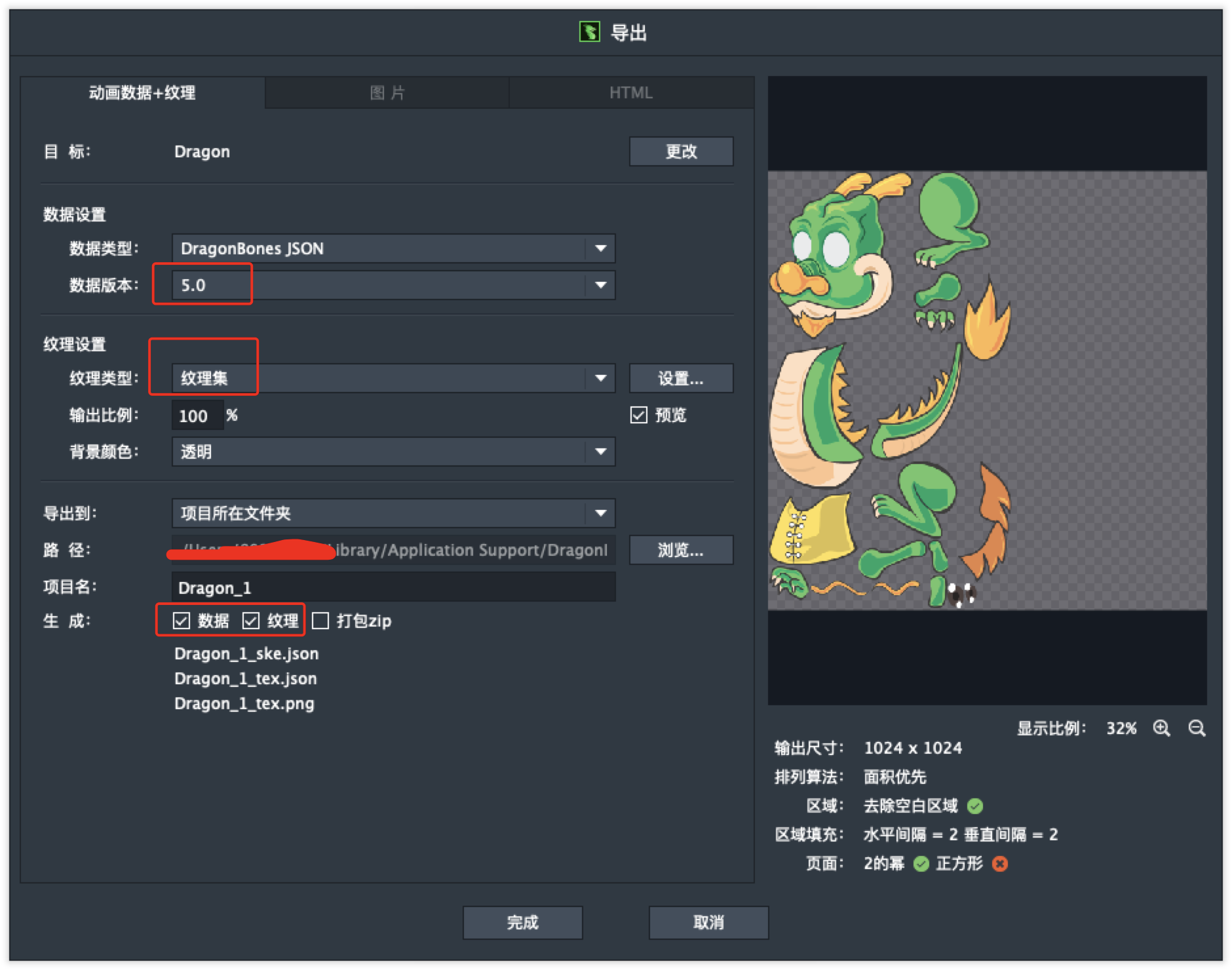(e) 通过IDE提供的工具将龙骨动画资源转换引擎可用的资源