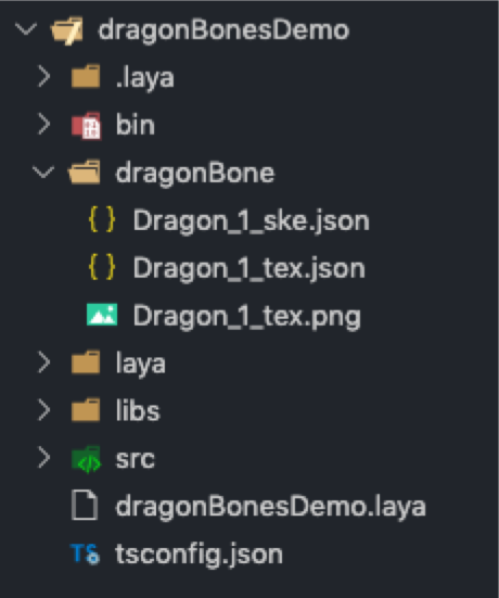 (f) 转换完成后,会在目录中生成*.png和*.sk文件,将文件放到项目的资源文件中 laya/assets/dragonBone(dragonBone文件为自己创建,取别的名字也可以)。