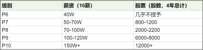一般来说一个应届生 P4、P5 入职,如果工作上足够努力、运气不太差的情况下,在** 6 到 10 年可以达到 P8 层级**。这之间,一般来说,从 P6 到升到 P7 是一个坎,因为从 P7 开始有股票,也开始涉及到管理能力,除了完成常规工作外,还要对业务和商业上的东西有思考,晋升上会比较困难。