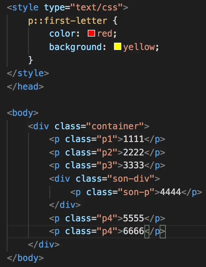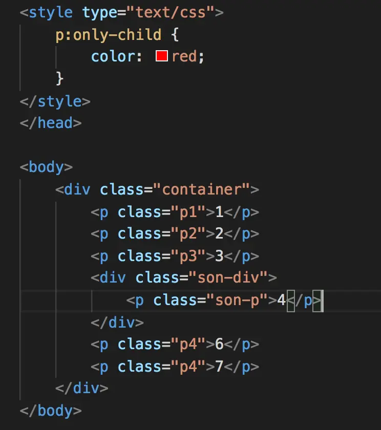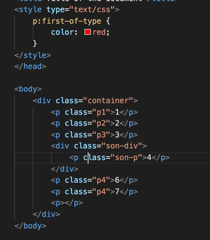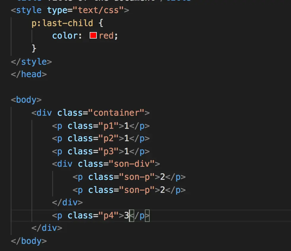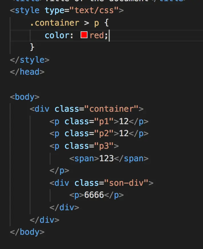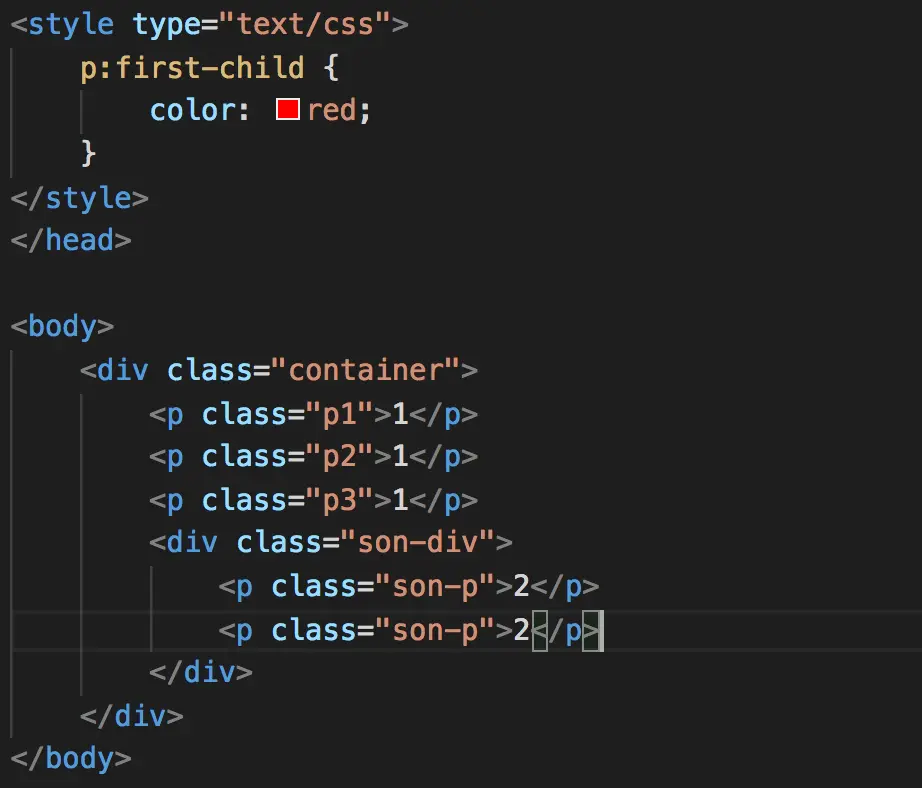 :first-child 选择属于其父元素的首个子元素;container中的第一个p元素和son-div中的第一个p元素的字体颜色都会变成红色