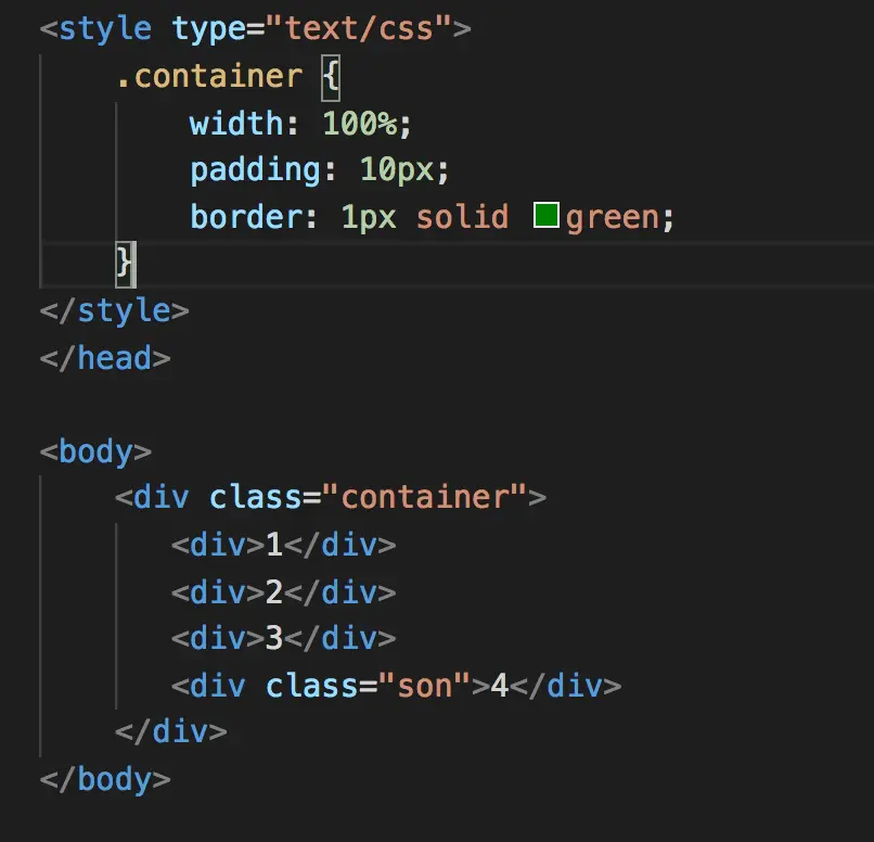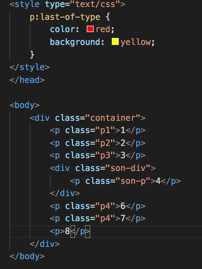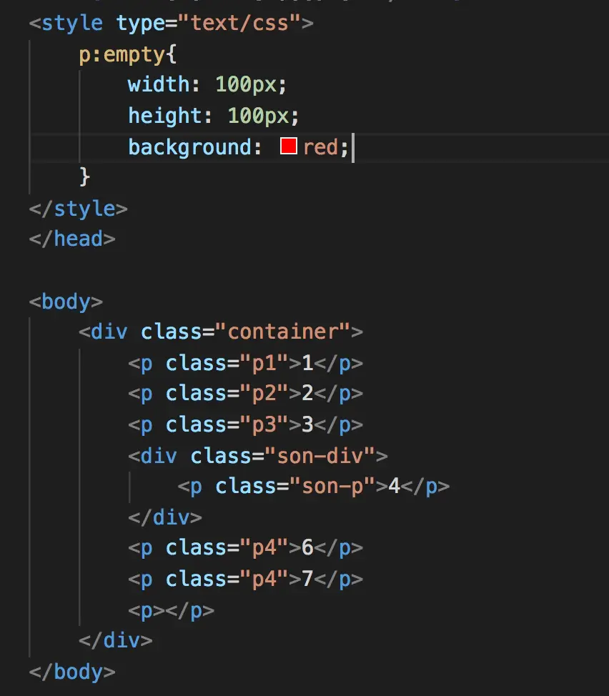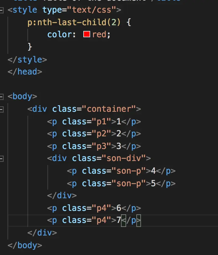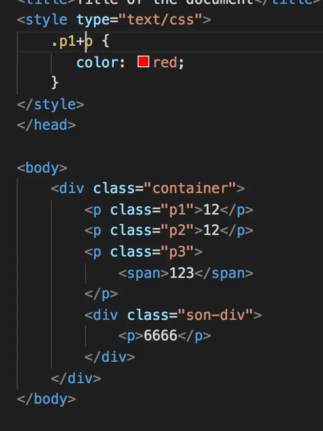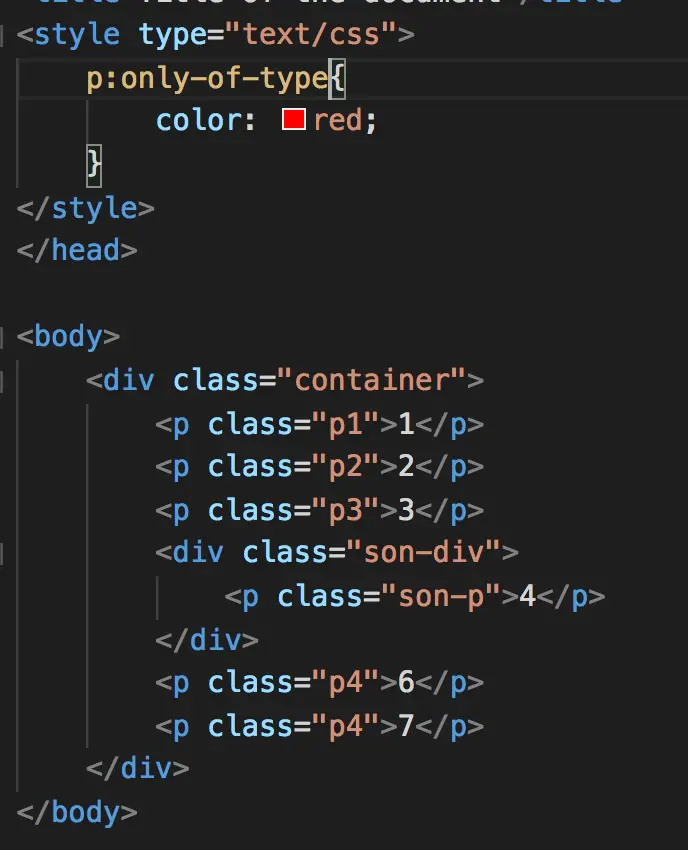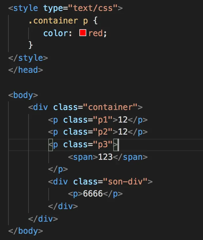:first-child 选择属于其父元素的首个子元素;container中的第一个p元素和son-div中的第一个p元素的字体颜色都会变成红色