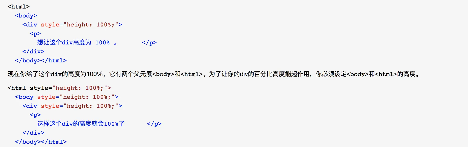 为了理解为什么不会,你需要理解浏览器是如何计算高度和宽度的。Web浏览器在计算有效宽度时会考虑浏览器窗口的打开宽度。如果你不给宽度设定任何缺省值,那浏览器会自动将页面内容平铺填满整个横向宽度。 但是高度的计算方式完全不一样。事实上,浏览器根本就不计算内容的高度,除非内容超出了视窗范围(导致滚动条出现)。或者你给整个页面设置一个绝对高度。否则,浏览器就会简单的让内容往下堆砌,页面的高度根本就无需考虑。 因为页面并没有缺省的高度值,所以,当你让一个元素的高度设定为百分比高度时,无法根据获取父元素的高度,也就无法计算自己的高度。换句话说,父元素的高度只是一个缺省值:height: auto;。当你要求浏览器根据这样一个缺省值来计算百分比高度时,只能得到undefined的结果。也就是一个null值,浏览器不会对这个值有任何的反应。 如果想让一个元素的百分比高度height: 100%;起作用,有两种方法 (1)设定显示的高度值