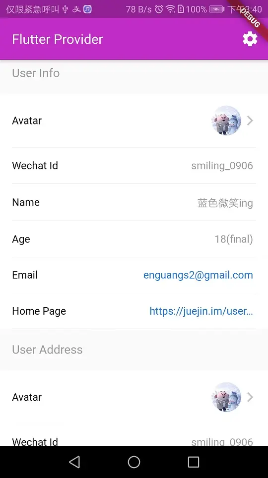 - 首页通过ListView展示Setting, User Info, User Address