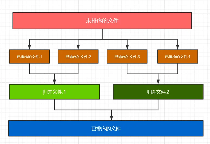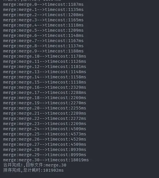 合并阶段,可以看出合并已排序的文件所用的耗时是不断递增的因为并合并的文件体积在不断的递增