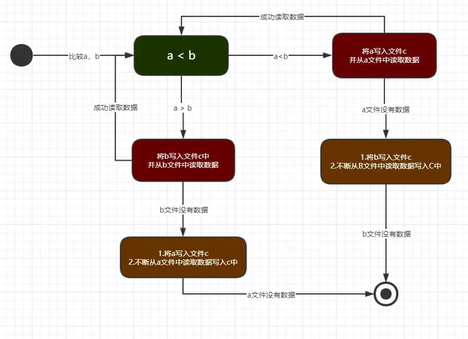 方案二、每次只从两个文件中读取一个整数,进行比较,然后将较大/较小(取决于你要增序还是降序)的数据写入文件中