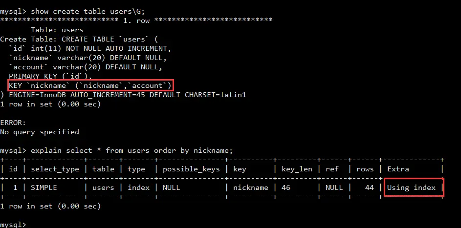 - 第二条语句可以直接使用索引(索引有序存储),在读取到索引对应的主键值后取相应的数据并直接返回给客户端即可,不需要使用到