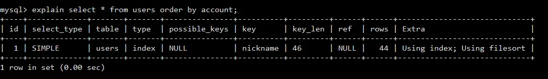filesort, 但由于account和nickname组合成了索引,每一个nickname对应的account都是有序,因此不同的nickname对应的account可以用来做归并排序(如上文所提到的合并阶段)