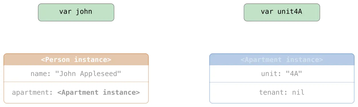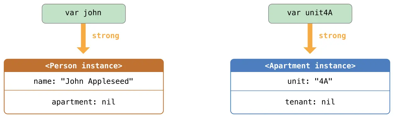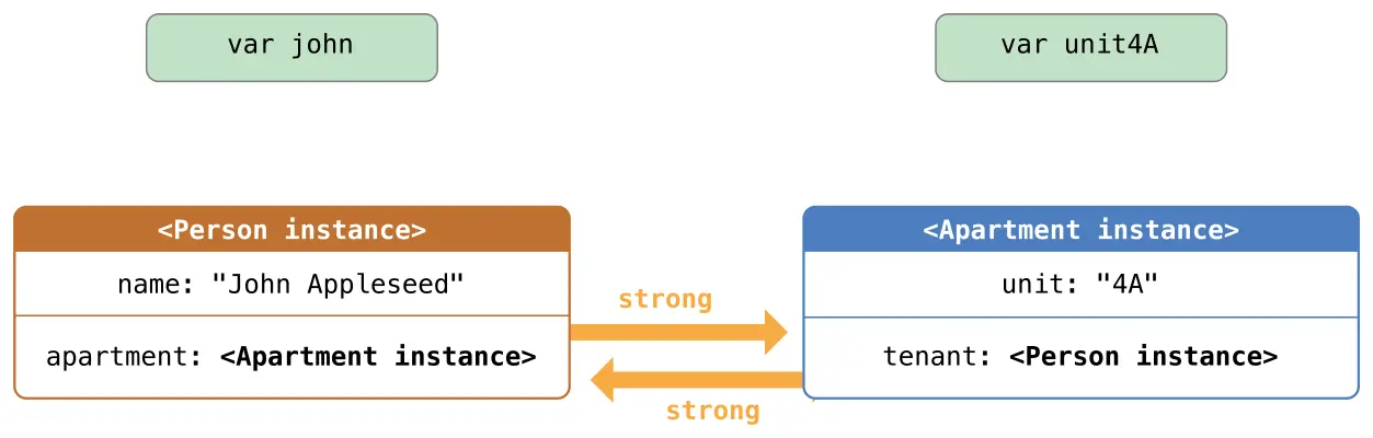 unit4A = Apartment(unit: "4A")这里是在创建和分配两个实例后强引用看起来的样子。john变量现在有对新的Person实例的强引用: