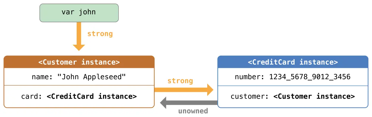 customer实例现在有一个对creditCard实例的强引用,creditCard实例对customer实例有一个非持有的引用。
