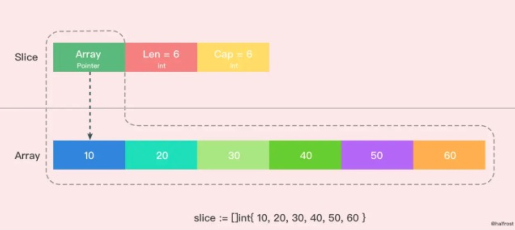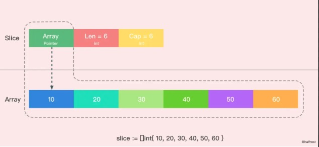 1)切片的结构是由3部分组成,Pointer是指向一个数组的指针,len代表了当前切片的长度,cap是当前切片的的容量。cap总是大于等于len 。