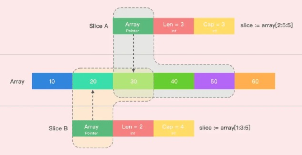 4)下图三的SliceA就创建出了一个len = 3,cap = 3的切片 。从原数组的第三位元素开始(0是第一位)开始切,一直切到第四位为止(不包括第五位)。(个人感觉第三张图的写法有误,应该是Slice := array[2:5],但是没办法解释SliceB的容量问题)
