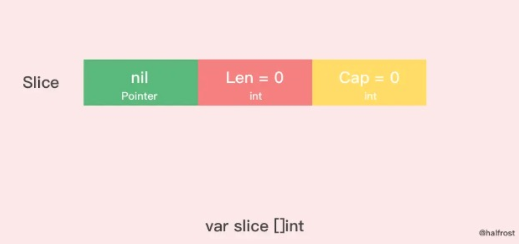 1)nil切片:var slice []int。nil切片被用在很多标准库和内置函数中,描述一个不存在的切片的时候,就会使用nil切片,比如函数发生异常的时候,返回的切片就是nil切片,nil切片的指针指向nil。