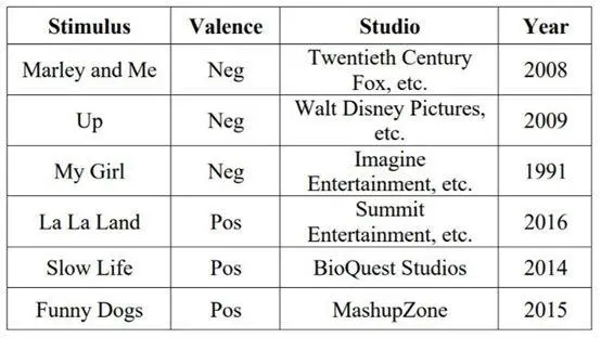 为了唤起不同的心理状态,实验利用了下表所示的一系列电影片段,分别代表积极效价和消极效价。