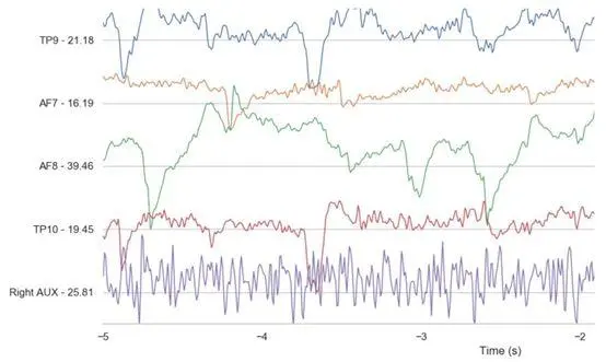 来源:四个Muse传感器的实时脑电图(EEG)流的实例,Right AUX无设备,并且由于只是噪音,无需考虑。这个实时反馈图在每个传感器的t=0处有一个测得的微伏特y轴,以及一个详细显示时间读数的x。