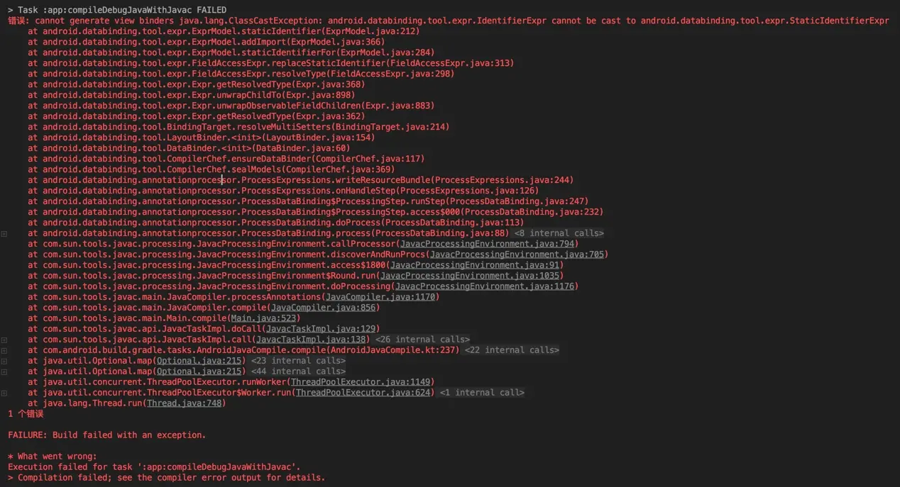 无法生成视图绑定器,报类型转换异常:android.databinding.tool.expr.IdentifierExpr类型无法转换为android.databinding.tool.expr.StaticIdentifierExpr类型 大致意思就是说标识引用类型不能转化成静态标识引用类型。