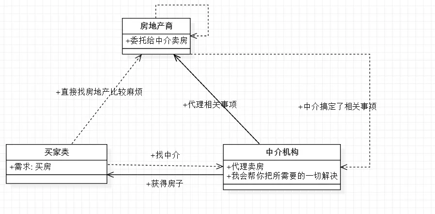 System.out.println("我是中介,你买房开始交给我啦!");
