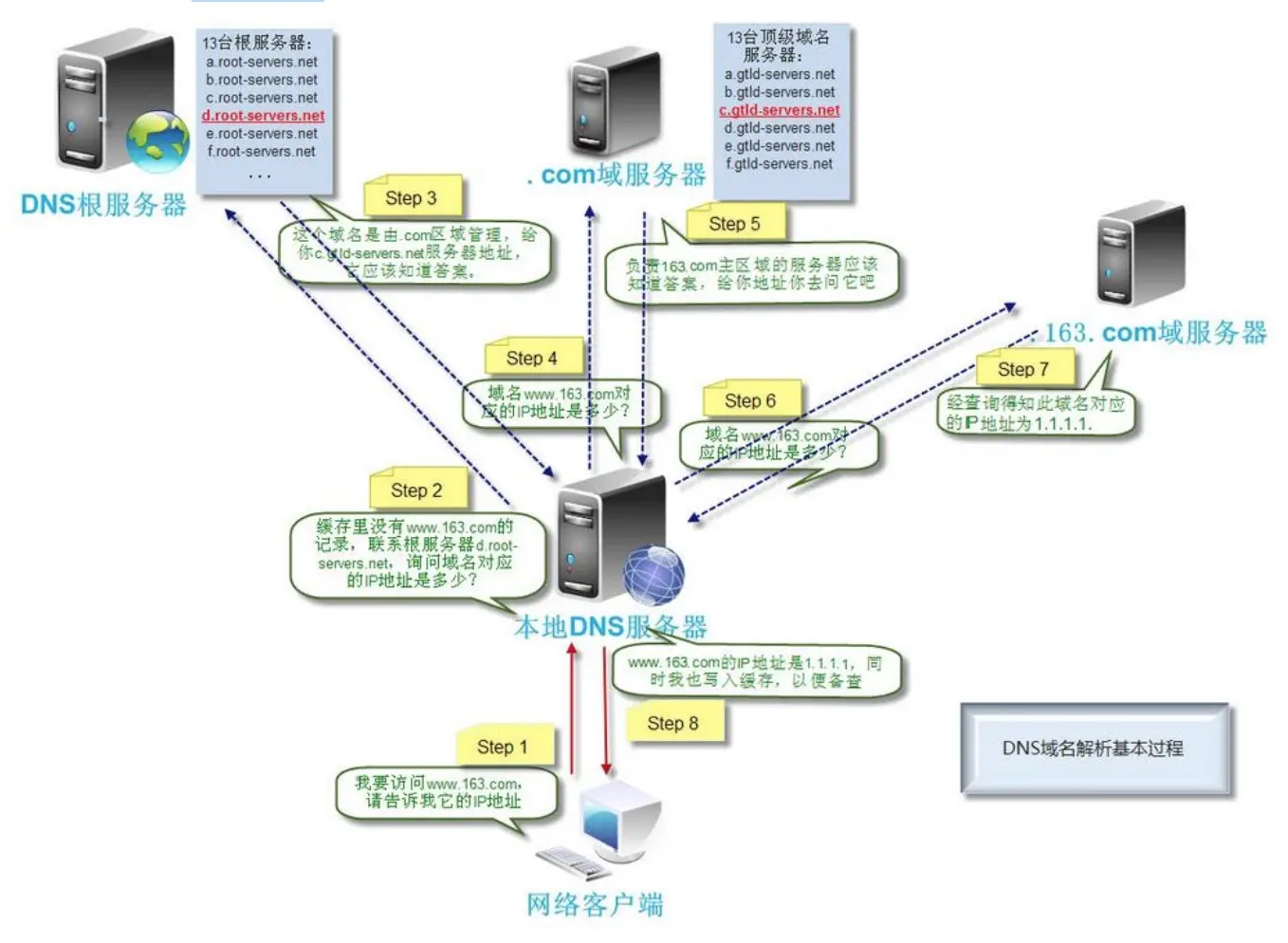 - 根服务器不会记录具体的域名和ip的对应关系,而是返回域服务器的地址.本地服务器会继续向域服务器发起请求.