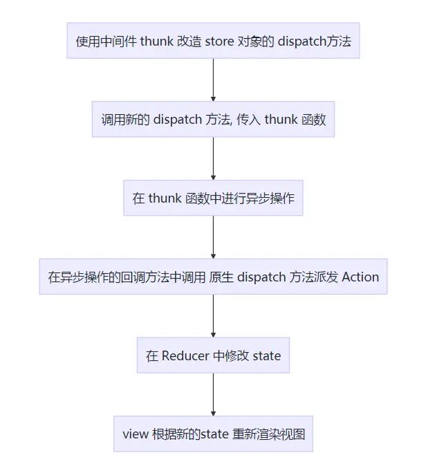 store.dispatch(post()), 我们调用的同样是 包装后的dispatch方法, post() 返回的是 函数即 thunk 函数, 所以 thunk函数 会自动执行。在 thunk函数 中, 我们可以执行 异步操作, 然后在 异步操作 的 回调方法 中调用 store 的原生 dispatch 方法, 派发 Action, 触发 state 的修改。