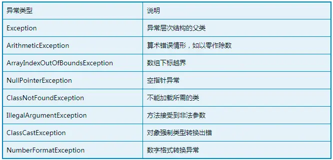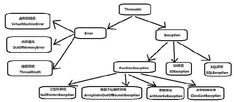 - 包括:检查性异常(checked exception)和非检查性异常(unchecked exception)