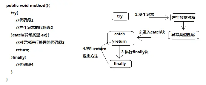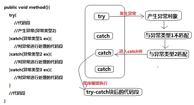 - 一旦某个catch捕获到匹配的异常类型,将进入异常处理代码。一经处理结束,则整个try-catch语句结束;