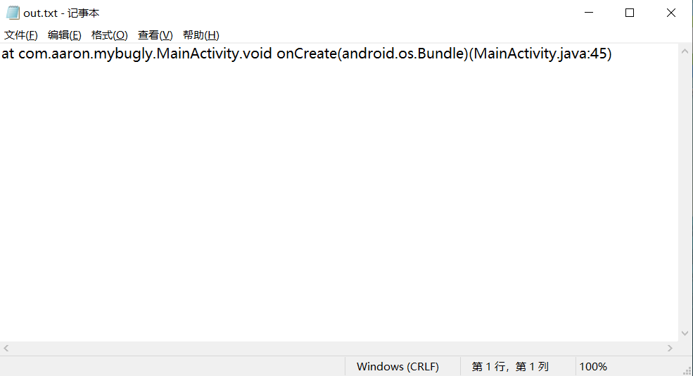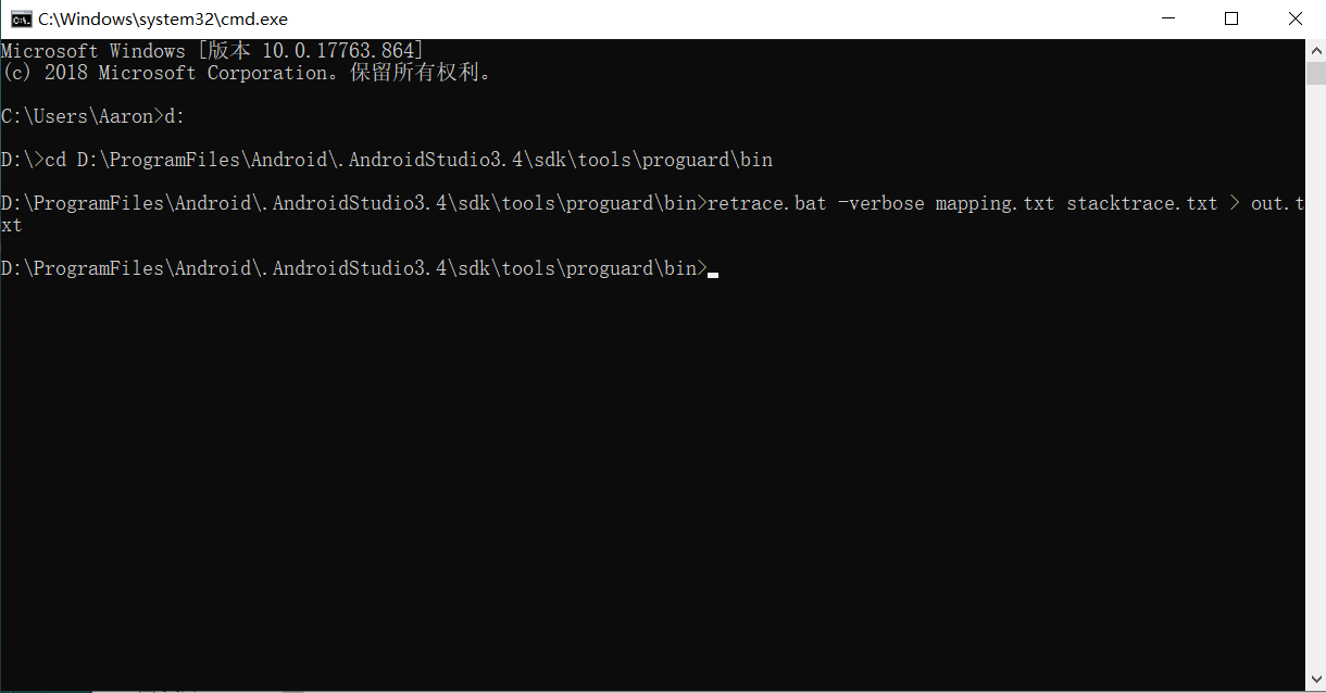 retrace.bat -verbose mapping.txt stacktrace.txt > out.txt,按下回车后当前文件夹下会生成一个out.txt文件,里面存放的就是真实的堆栈信息,如下图所示。