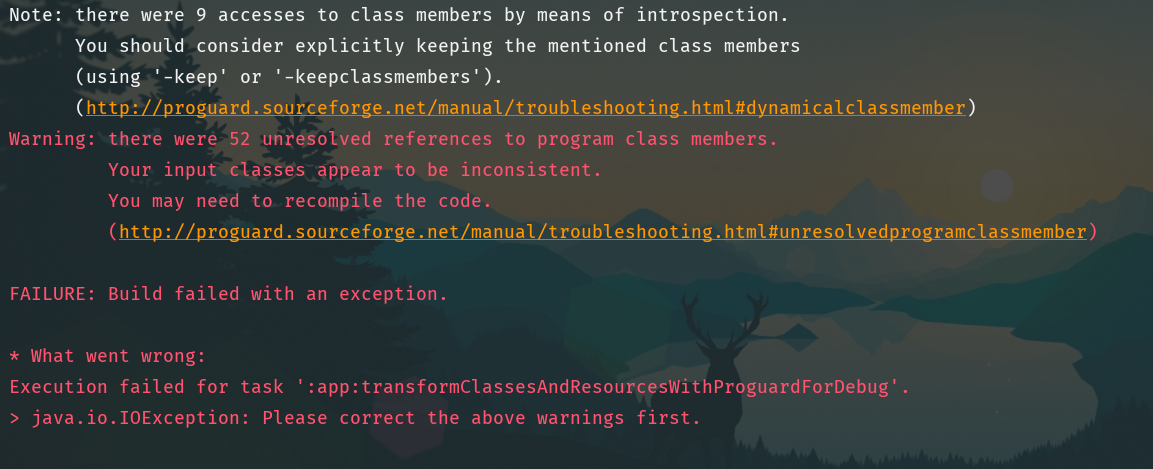 如果你还是觉得上述方法比较麻烦没有原来的好用的话,其实还有一种,就是禁用 R8 ,用回 Proguard ,在项目根目录的 gradle.properties 中写上 android.enableR8=false 即可,然后你可能会在生成 APK 时遇到如下图的报错,那就在 proguard-rules.pro 中写上 -ignorewarnings ,这样就能顺利编译了,也可以用回 proguardgui.bat 的图形化界面,前提是你有备份旧的 proguard.jar 和 retrace.jar 。