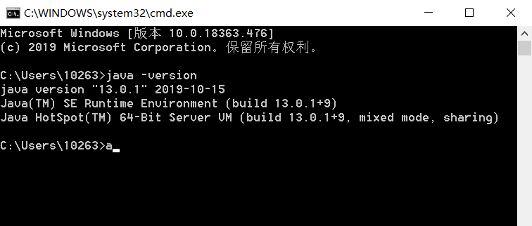 最后打开控制台,输入 java -version 显示以下信息,则表示安装完成