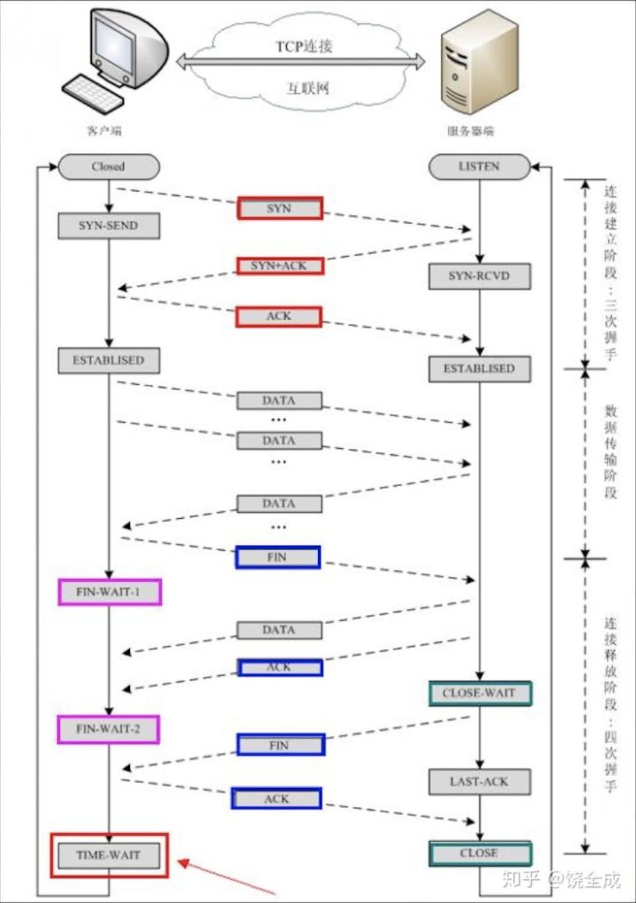 想了解 TCP 的连接状态,必须先理清楚 TCP 的三次握手和四次挥手是怎么回事,下图关于 TCP 三次握手和四次挥手的状态转换图(图片来自于知乎文章 《“三次握手,四次挥手”你真的懂吗?》):