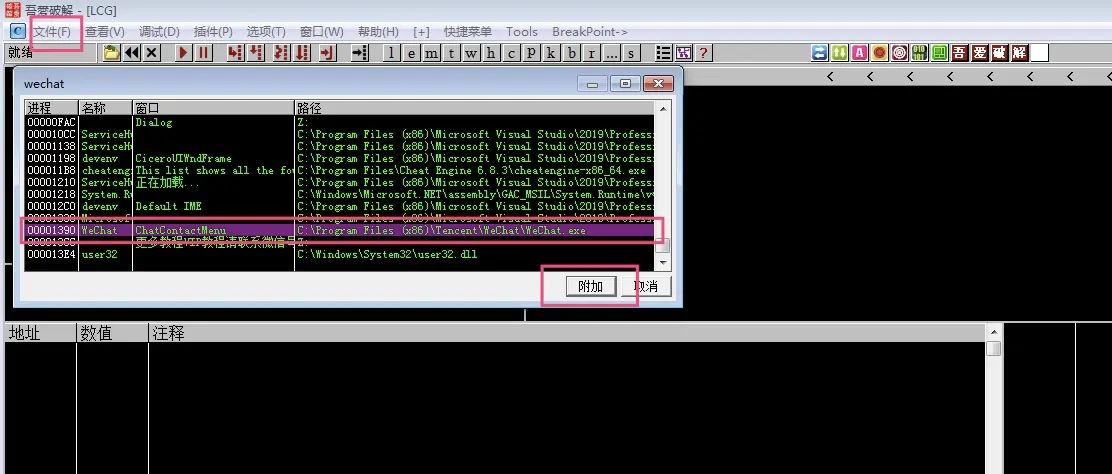 点击文件 --> 附加 --> 输入 wechat --> 找到 WeChat.exe 点击附加,将其内存加载进 OD 中