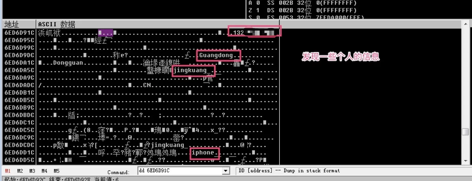 通过 Command 输入前面找到的 地址,使用 dd + 地址则可(OD具体的操作指令)