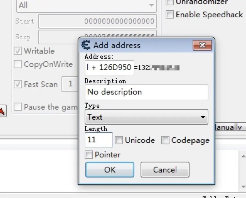 将 OD 中找到的电话号码的内存地址填入,然后 Type 选择 Text,因为电话号码长度为 11,所以 Length 也填入 11,从而从微信内存中找到我个人微信绑定的手机号,但这个地址是动态地址,即下次重新其中微信后,手机号的内存位置通常不会在这里,所以要找到其基址。
