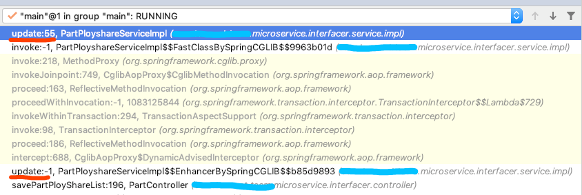 可以看到,代理类会检查当前调用的方法是否有拦截器List<Object> chain = this.advised.getInterceptorsAndDynamicInterceptionAdvice(method, targetClass);。如果没有(方法上没有开启事务),就会直接调用原始方法methodProxy.invoke(target, argsToUse)。如果有,则执行CglibMethodInvocation.proceed()方法。这时候就是平时常见的AOP-Chain链模式了。