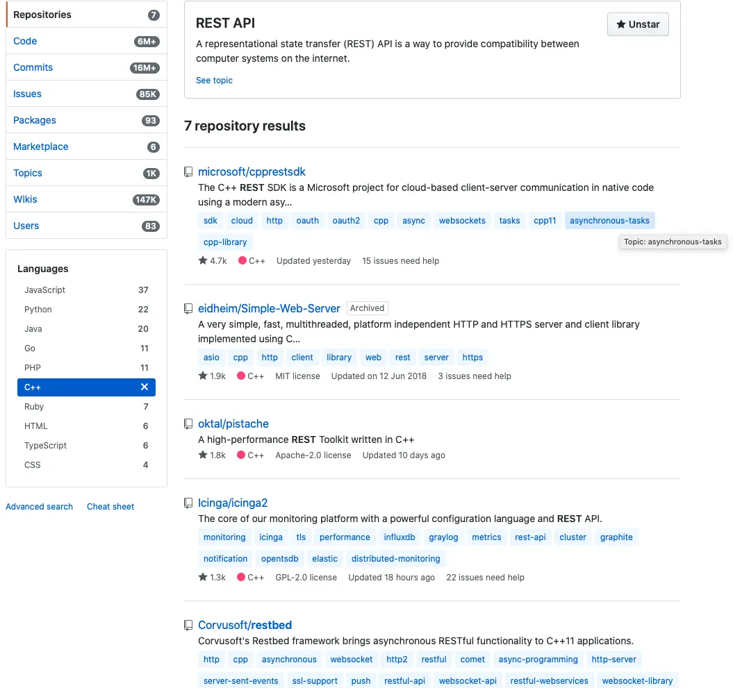 以前为了完成课程作业,临时学了不少Python和Java的Web编程技术,如Django、Spring Boot,这两个框架可以很容易编写Restful接口供前端调用,而且这个也是我在编写C++程序所从未使用过的,所以我十分好奇C++是否可以编写Restful接口呢?于是我到GitHub上逛了一圈: