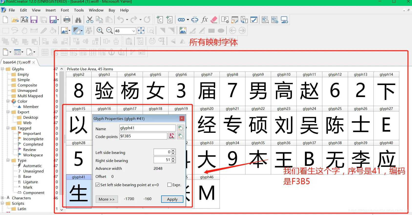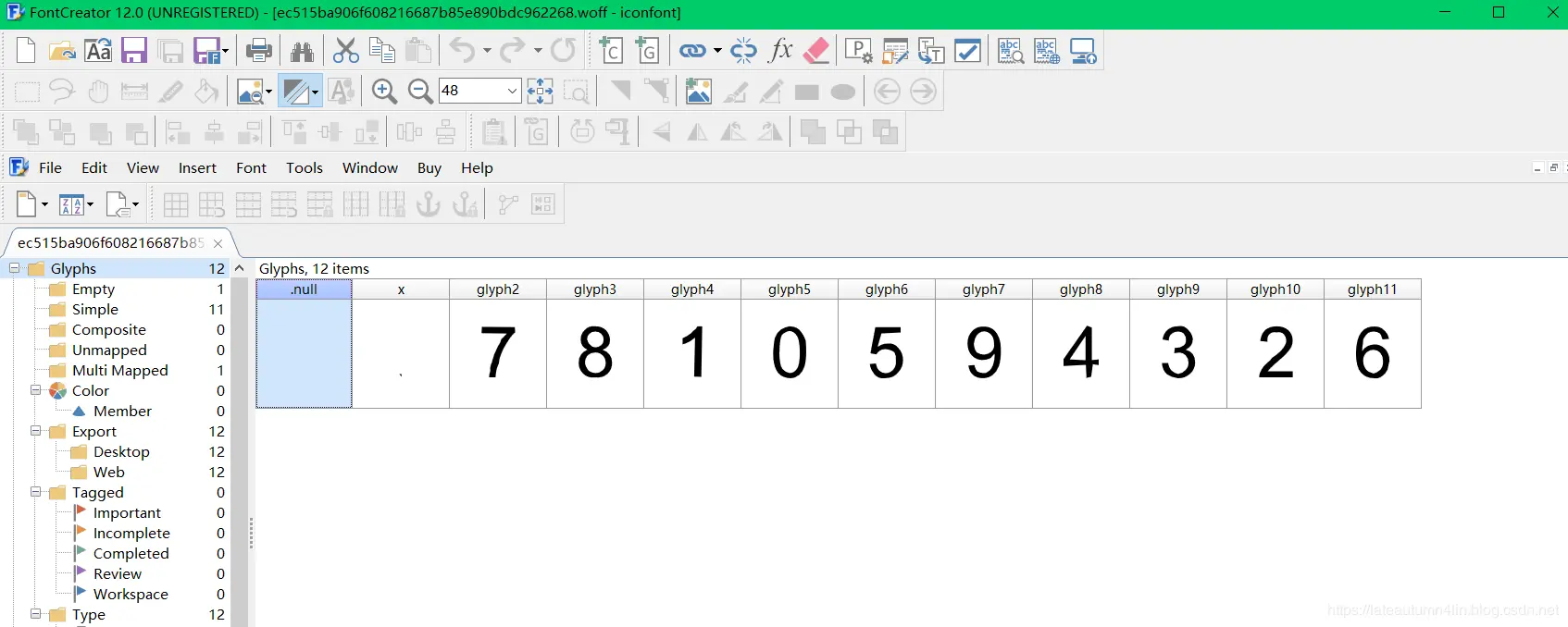 这里我们使用FontCreator,我们把FontCreator下载下来,传来一个我们之前准备好的woff文件看看效果