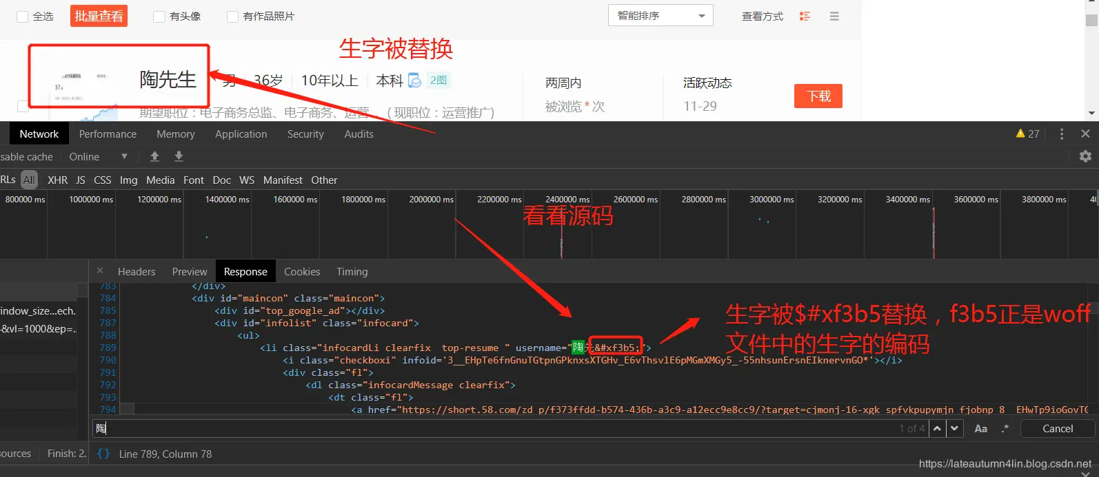 反爬方:一开始的时候,字体反爬还没有发展的很成熟,所以大部分网站使用字体反爬的方式是使用固定的字体文件来做数据替换,固定的字体文件就表明每个数据的编码是写死的,不变的,那么每次网站引用这个woff文件之后,都可以用相同的编码来替换想要替换的数据,这就是最初的时候的字体反爬。 应对方:既然他们的字体文件不变,那我们就直接解析他们的固定的woff文件就行,我们使用Python的fontTool库的ttLib包,代码如下: