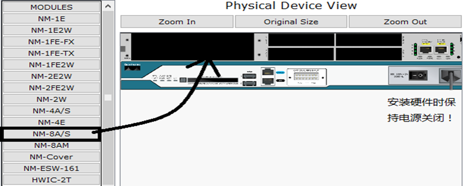 需要强调的是,为了配置PPP,路由器之间必须使用serial接口。在图中,我们使用的路由器是2811,为了使它支持serial接口,我们需要在上面安装一硬件模块(8端口异步/同步串行网络模块),直接将要安装的硬件拖到合适的地方即可。如下图所示: