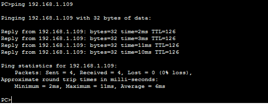 - 将PC0的网关设为192.168.1.1与所连接的路由端口的IP相同,它的IP设为192.168.1.109,子网掩码默认为255.255.255.0(PC1的配置类似,只是网络号不同(192.168.3.0))。