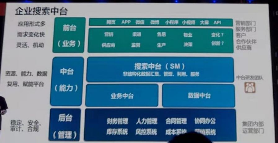 搜索中台:基于后台为前台提供结构化/非结构化数据汇集、管理、利用、服务支撑。