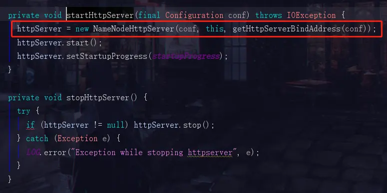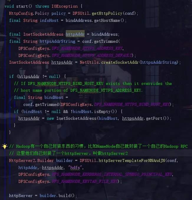 此时我们看见创建HttpServer的代码了,我们如果是初次搭建我们的大数据集群时,是不是会访问一个50070的web页面,比如