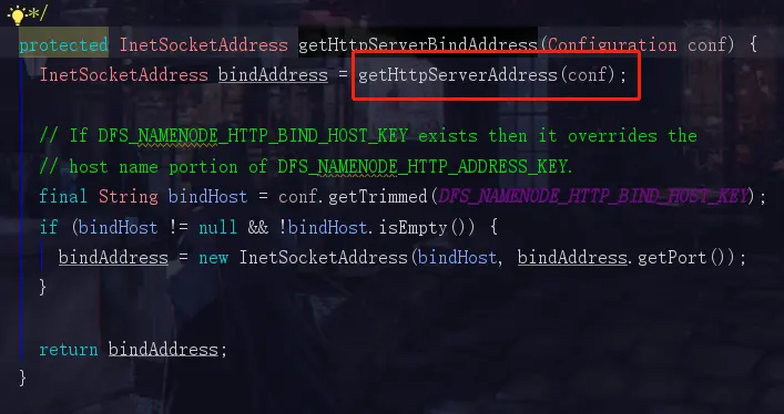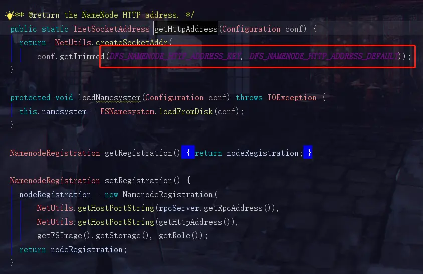 DFS_NAMENODE_HTTP_ADDRESS_KEY是自己手动配置的地址,但是一般我们都没有去手动配置,所以hadoop会使用一个默认的地址 DFS_NAMENODE_HTTP_ADDRESS_DEFAULT