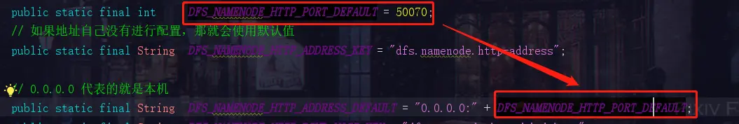 然后我们看到了这两个参数,DFS_NAMENODE_HTTP_ADDRESS_KEY 和 DFS_NAMENODE_HTTP_ADDRESS_DEFAULT