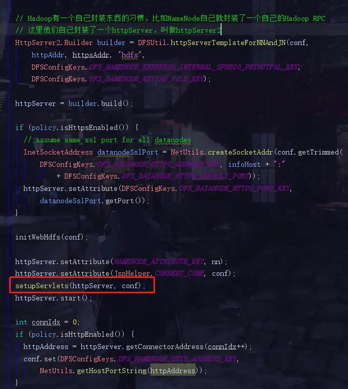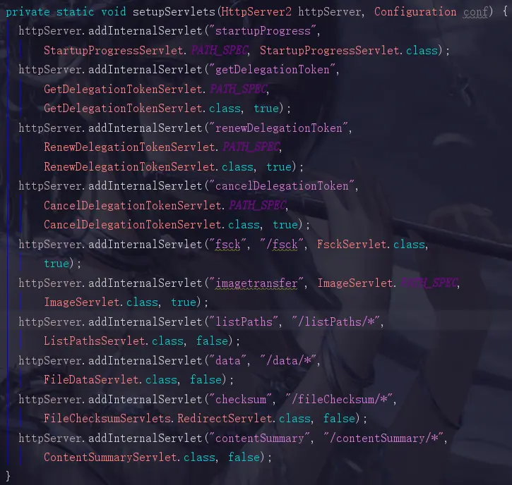 首先我们现在是有一个HttpServer2(Hadoop自己封装的HttpServer),它上面绑定了很多提供各种各样功能的servlet