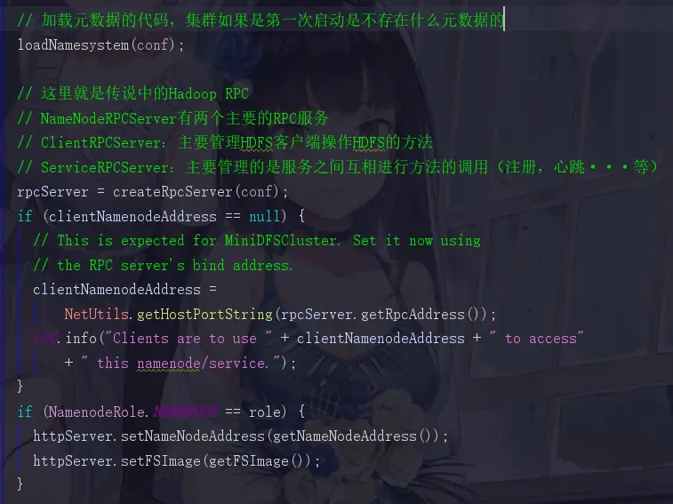回到1.4.1中的那张HttpServer的那个位置。在启动HttpServer后,会加载元数据,但是我们现在模拟的场景是集群第一次启动,第一次启动的时候是不存在元数据的,所以我们先直接跳过这个步骤,去到Hadoop RPC的位置