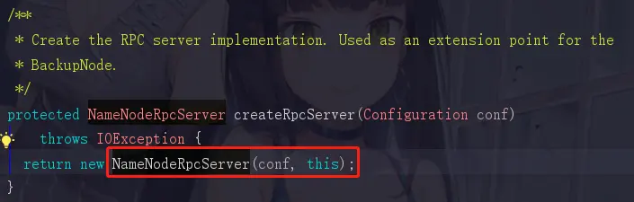 这里的注释为写了创建RPC服务端实现,它return了一个NameNodeRpcServer,那是不是它才是我们要找的NameNode服务端呢?