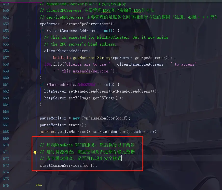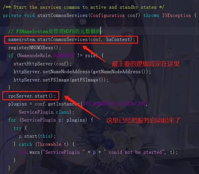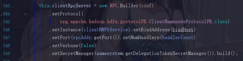 还记得我们刚才说过,两个服务一个是提供给内部的DataNode去调用,而另外一个是提供给服务端去调用的,所以这里这俩,第一个serviceRpcServer是服务于NameNode和DataNode之间调用的,而第二个clientRpcServer是服务于客户端与NameNode,DataNode进行交互调用的