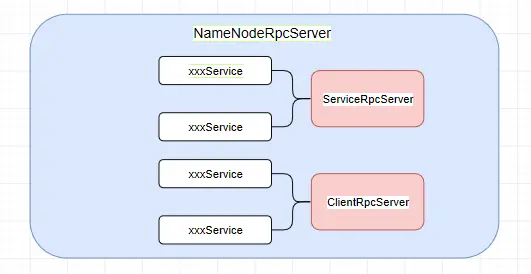 把NameNodeRpcServer的结构图画出,也就是主体为 serviceRpcServer 和 clientRpcServer ,然后它们俩提供了各种各样的服务方法