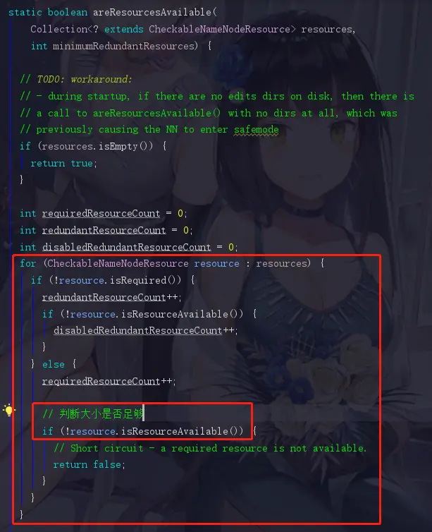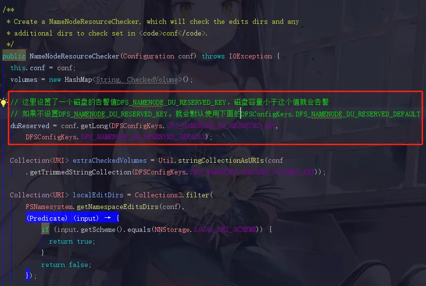 !nameNodeHasResourcesAvailable()直接翻译过来,磁盘空间是否充足,对,引用的就是上面提过的hasAvailableDiskSpace,直译过来就是有没有可用空间.