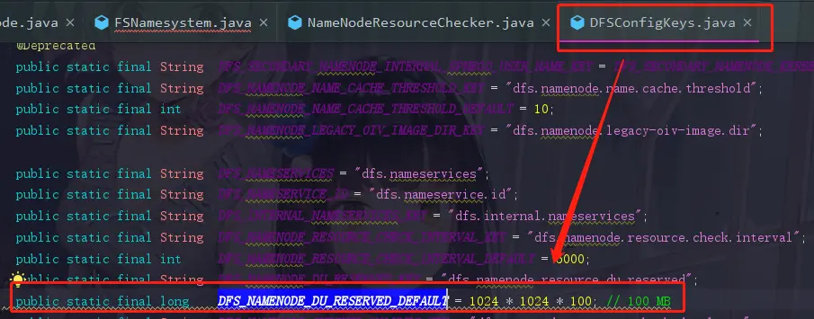 这里是一个duReserved的值,它可以让我们自行设置,如果不设置,就使用它给我们的默认值。我们也可以查看一下这个DFS_NAMENODE_DU_RESERVED_DEFAULT的默认值,它为100M,定义在DFSConfigKeys.java中