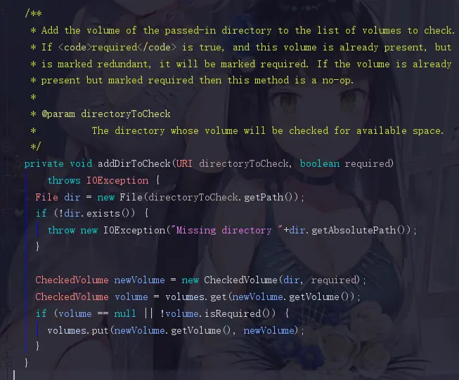在HDFS上很多位置都可以看到volumes这个单词,volumes其实就是一个存放需要检查的目录的目录集,注释上的第一句话“Add the volume of the passed-in directory to the list of volumes to check.”意思就是将传入目录的卷添加到要检查的卷列表中,这里的卷就是volumes。