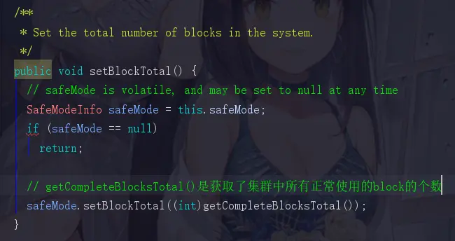这里就是设置何时可以退出安全模式的代码,threshold默认值为0.999,比如我们总block数为1000,那如果存在999个isComplete的block,也就认为集群是健康状态,而可以退出安全模式。
